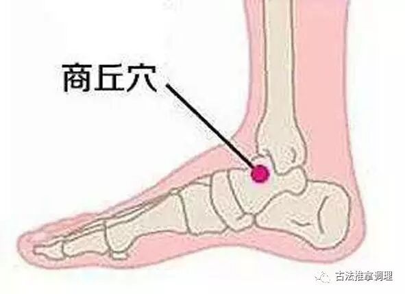 功效:它正对应足底反射区中的下身淋巴反射区,因此可以治疗各种炎症。 商丘穴多用于神经性呕吐、消化不良、胃炎、急慢性肠炎、腓肠肌痉挛、踝关节及周围软组织疾患等。