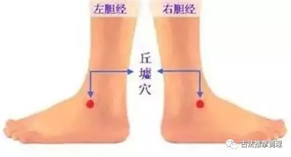 功效:按摩丘墟穴可以舒筋活络、疏肝利胆、消肿止痛,缓解治疗胸胁满痛,颈项强、偏头痛、腋下肿,胆囊炎、中风偏瘫、下肢痿痹、疟疾、以及肋间神经痛、坐骨神经痛、脚气、足跟痛等, 按摩丘墟穴可以清晰头脑、能使自己情绪稳定,能承受不幸等心理压力等。