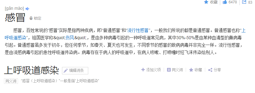 在网络百科上查询感冒,我们会发现普通感冒也称上呼吸道感染,是包括鼻腔、咽或喉部急性炎症的总称,病原体为病毒,仅少数由细菌引起。
