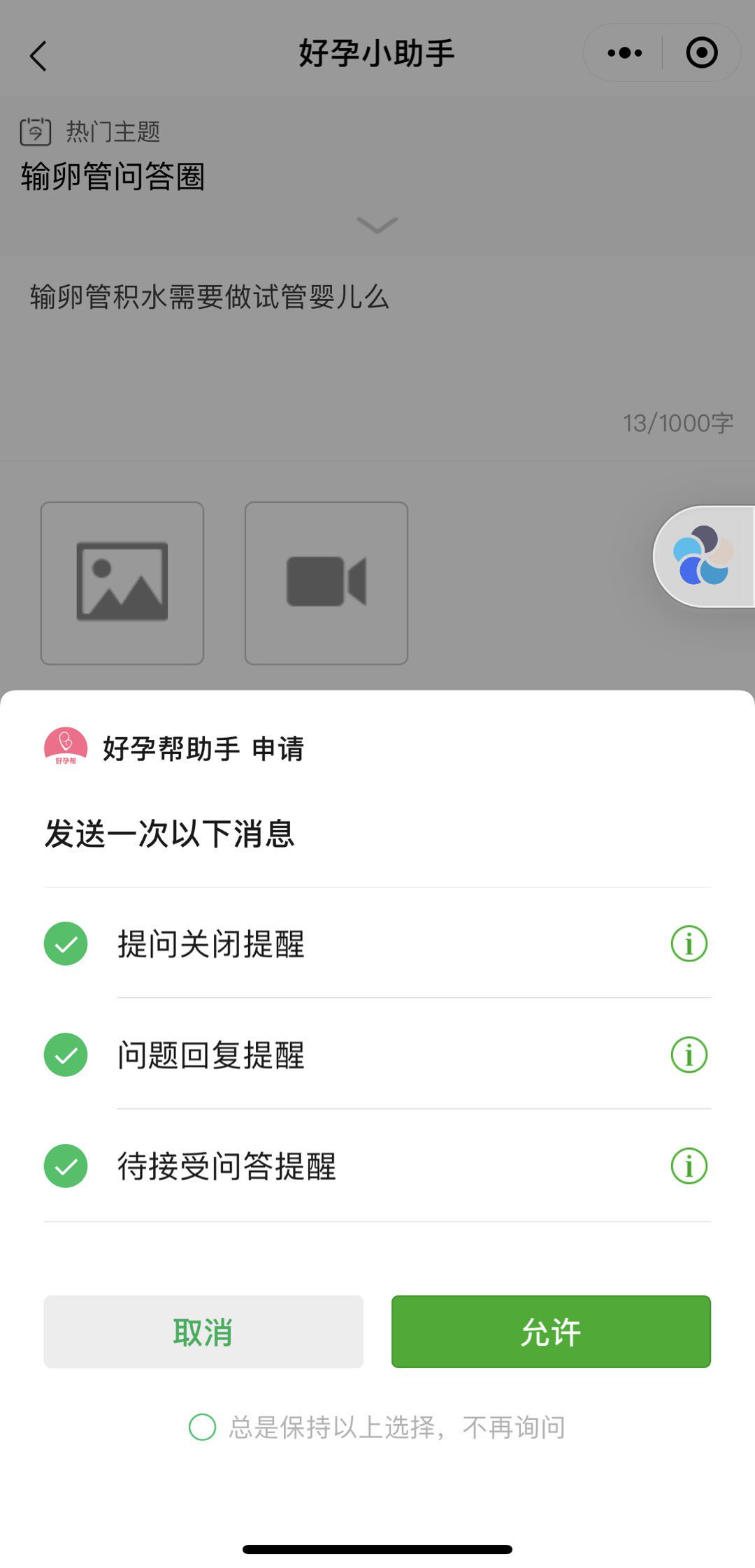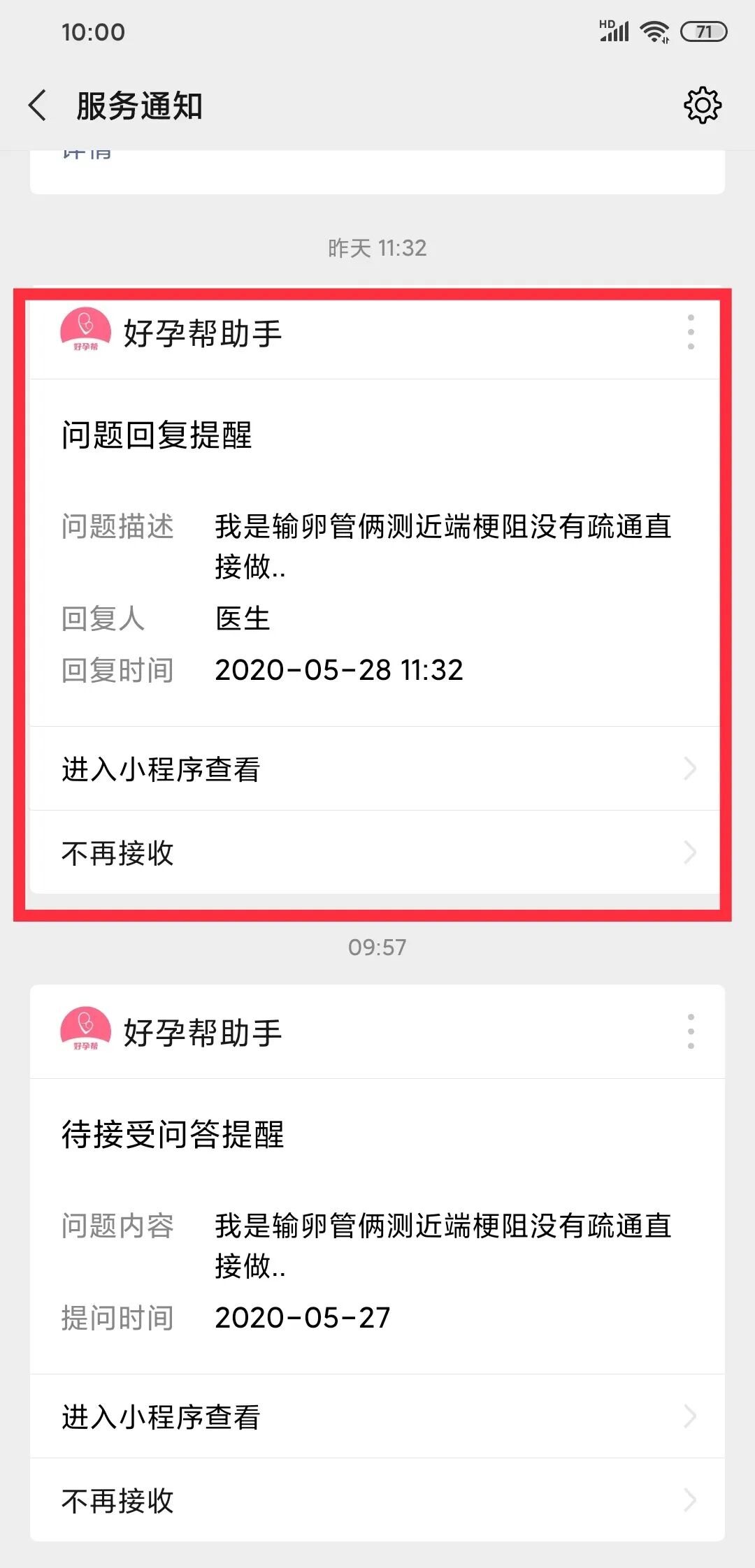 医生首次回复会收到小程序提醒消息,受微信限制,请务必点击允许提醒,否则会错过提醒。小程序只会提醒一次,不会造成骚扰。