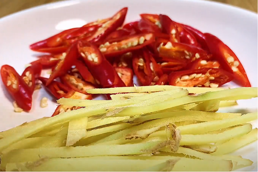 3、小米椒切片,生姜切丝备用。