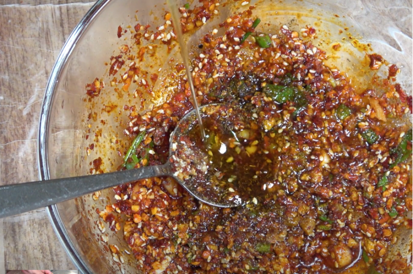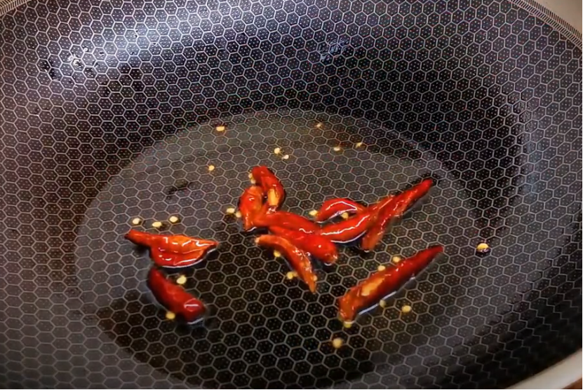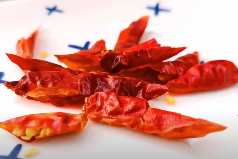4、关火后加入干辣椒段,翻炒几下,然后盛出来一旁放凉,花椒红油就做好了。