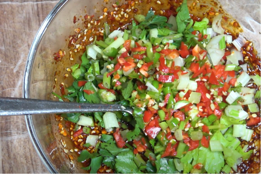 4、加入青红辣椒丁、芹菜粒、香菜末加进来搅均匀。