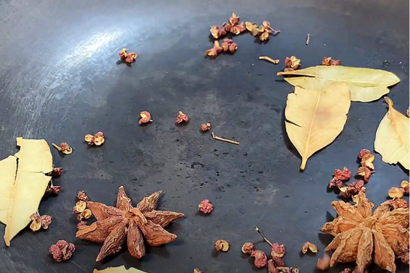 4、锅里不用放油,放入一小把花椒,两个八角,几片香叶,用小火把香味炒出来。