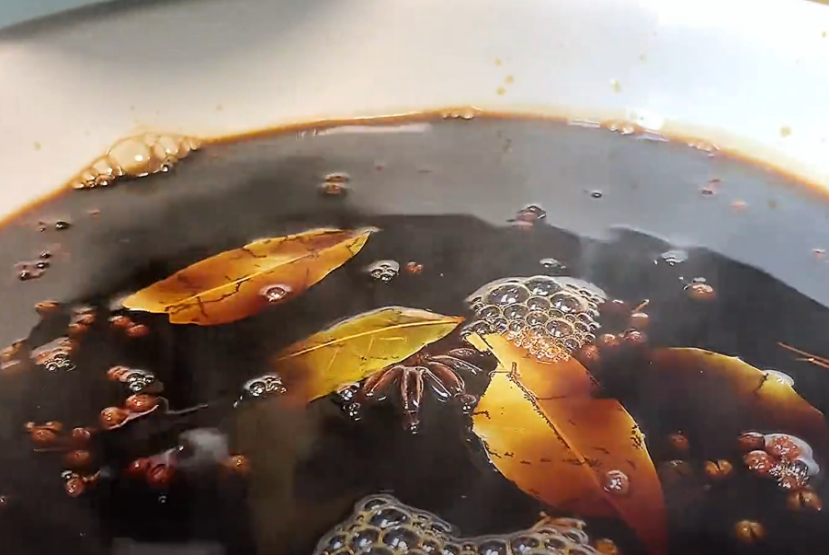 5、接着往锅里加入500克生抽,500克陈醋,60克冰糖搅拌均匀,把料汁完全煮开后再小火熬制5分钟,关火,将料汁倒入一个干净的盆子,放凉。