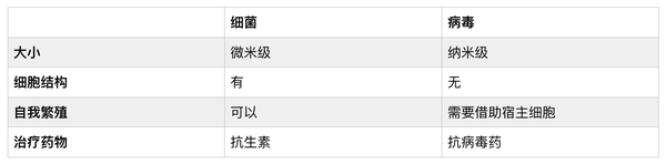 细菌和病毒是两种不同的生命体,两者的一些重要区别请见下表:
