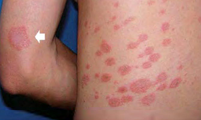 ②临床表现:不同部位表现不同,主要为有鳞屑的红色斑片, 境界清楚,皮损边缘不断向外扩展,中央趋于消退;