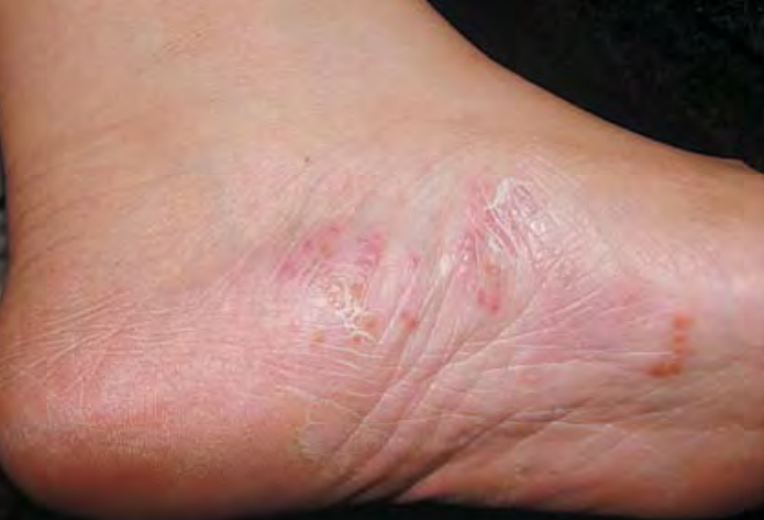 ②水疱型:多见足底或手掌出现水疱,甚至几个水疱融合成较大的水疱,边界清楚,皮肤不红,疱破脱屑;
