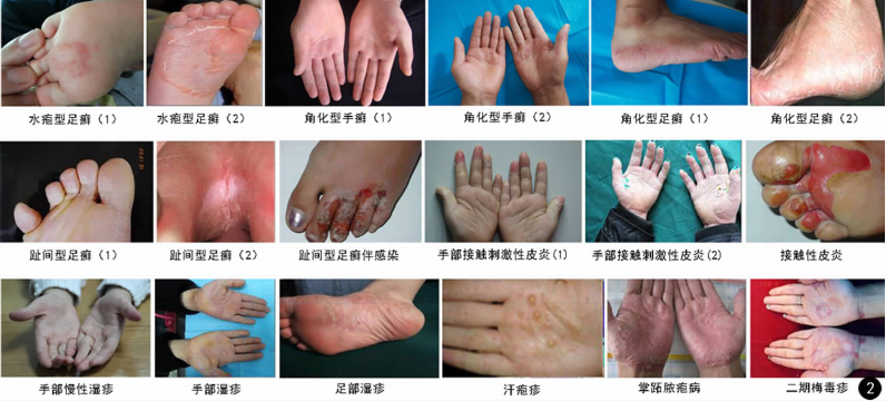 手足癣的水疱、脱屑、角化等表现与发生在手足部位的某些其他皮肤病相似。下面介绍几种容易与手足癣相混淆的疾病: