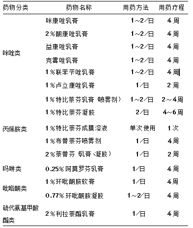 手足癣外用药物治疗应根据皮损类型的不同, 选择不同剂型的外用药。