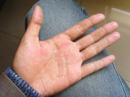 在临床上手癣分水疱鳞屑型和角化增厚型两种类型!