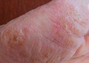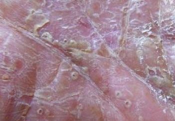 多由水疱鳞屑型发展而成。患者常有多年病史,累及双手,也可为单侧。皮损一般无明显的水疱或环形脱屑。掌面弥漫性发红增厚,皮纹加深,皮肤粗糙,干而有脱屑。冬季则常发生开裂,有时裂口很深伴出血,疼痛难忍,影响活动。促使手掌角化增厚的因素除皮肤癣菌外,还与长期搔抓、洗烫,肥皂、洗涤剂、各种化学物品和溶剂刺激以及不当治疗有关。