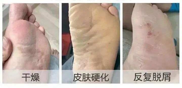 好发于手掌、指腹侧、足跟、足侧及足掌部。由于真菌感染引起皮肤干燥、角质粗厚、脱屑,易发生皲裂。本型无水疱及化脓,病程缓慢,常年不愈,大多由糜烂型、水疱型转化而成。