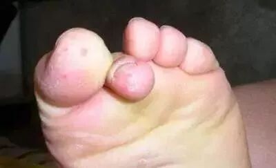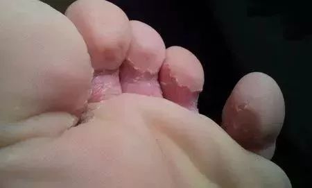 浸渍糜烂型:趾缝之间浸渍糜烂,出现白色的溃疡,这种脚癣比较容易合并感染,从而引发丹毒。