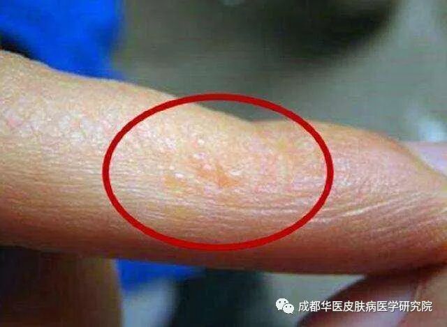 多见足底或手掌出现水疱,甚至几个水疱融合成较大的水泡,边界清楚,皮肤不红,疱破脱屑。
