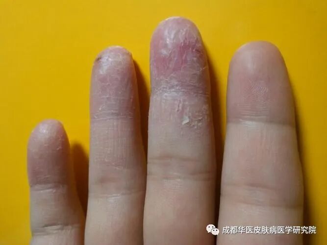 多见趾(指)间皮肤发白,糜烂、浸渍,边缘清楚,去除浸渍的表皮,留下潮湿的鲜红新生皮肤。