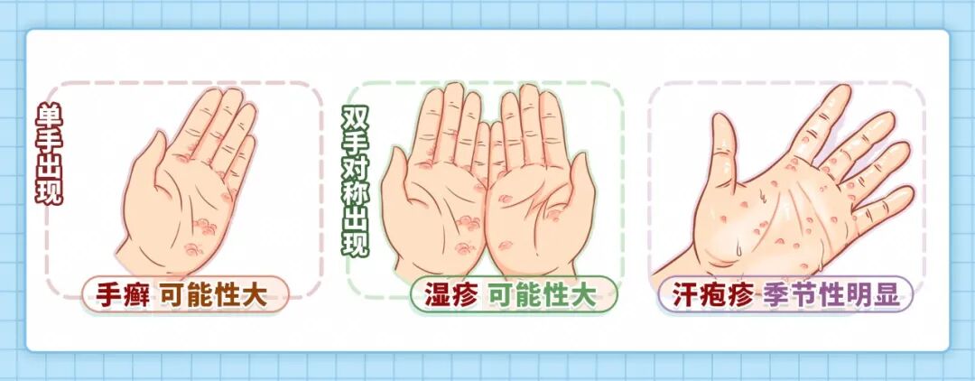 除了手癣,临床中常见的湿疹和汗疱疹,同样可以表现为水疱,但三者特点各有不同。