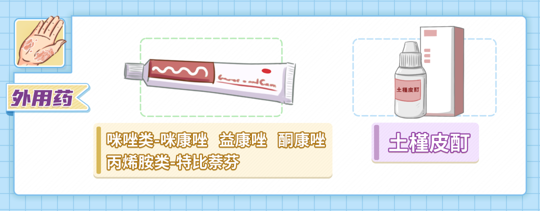 常见的外用药有,咪唑类的咪康唑、益康唑、酮康唑等软膏;丙烯胺类的特比萘芬软膏,还有中药的土槿皮酊等;