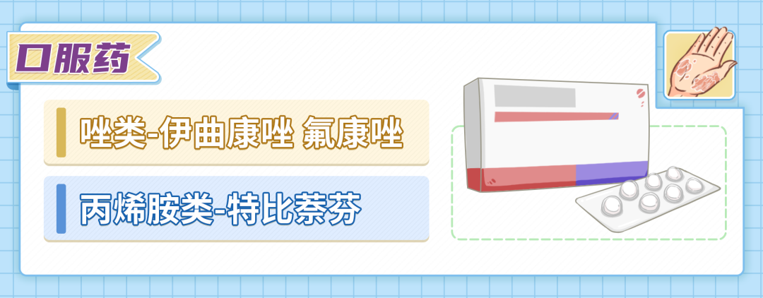 口服药比如唑类的伊曲康唑、氟康唑;丙烯胺类的特比萘芬等。