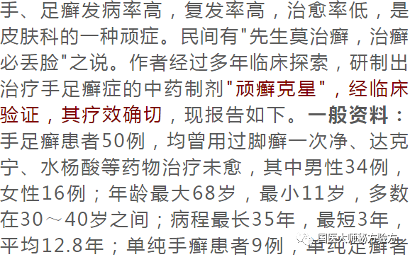 厚、干燥、皲裂、疼痛和屈伸不利为主症。治疗方法:顽癣克星由苦参100克,全蝎30克,蜈蚣10条,冰片20克,凡士林1000克组成。 先将苦参、全蝎、蜈蚣制成细粉, 再将凡士林加热熔化,再放入冰片,倒入药粉共调匀,放冷后成膏。先用温水浸泡患处20min使角质层软化,有条件时可刮除角质层,然后擦干皮肤涂上药膏。皲裂严重者可加压包扎固定,每日换药1次。治疗结果:全组50例患者中治愈者33例,占66%,治疗后皮肤完全恢复正常;15例好转,占30%,症状基本消失或减轻; 2例无效,占4%。总有效率96%。治疗天数:经1周治疗治愈4例,好转6例;经2周治疗治愈12例,好转7例;经3周治疗治愈14例好转2例;经4周治疗内治愈3例。体会:手足癣是