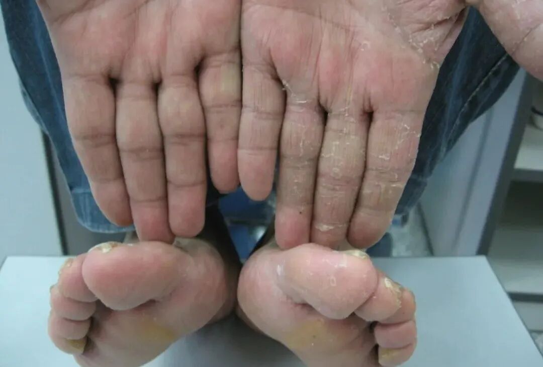 主要表现为足趾、足缘、足跟部皮肤增厚、粗糙、脱屑;足跟可有较深的裂口,引起疼痛。