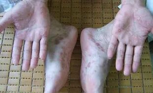 五、病情评估:患者可能为浅部真菌感染,表现为足癣,手部也有轻微感染,长期未得到彻底根治。