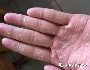 或疏散分布,自觉瘙痒,水疱干后脱屑并逐渐向四周蔓延扩大形成环形或多环形损害,边缘清楚、病程慢性、持续多年,直到累及全部手掌并传播至手背和指甲,甚至对侧手掌。有时水疱可继发感染形成脓疱。