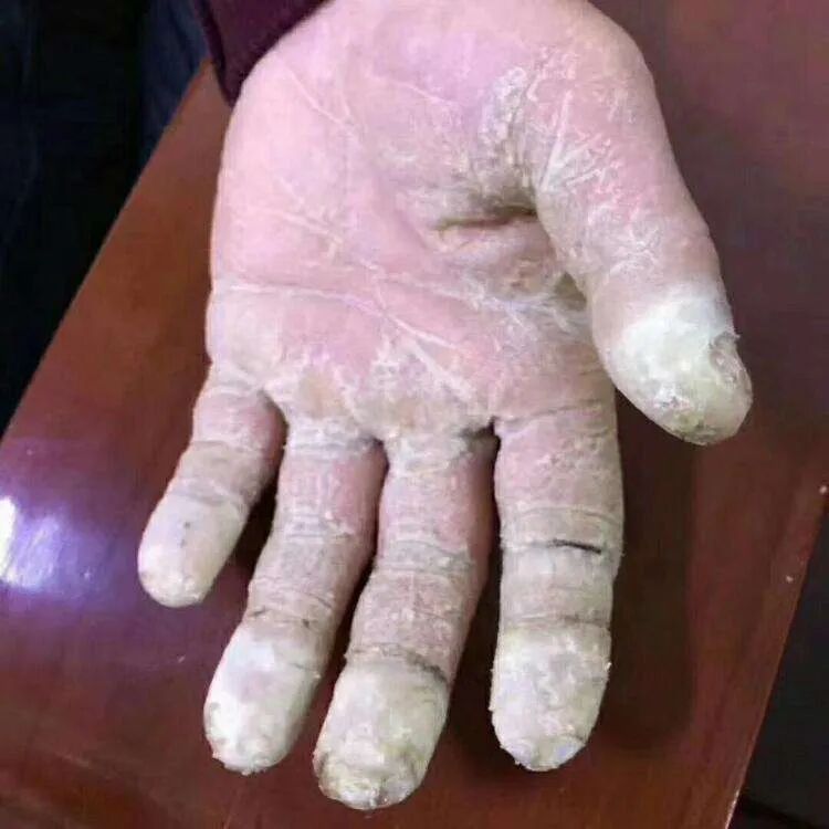 症状:表现在手足部位的干燥性暗红斑,皮损肥厚,渗液、糜烂,边缘比较清楚,冬季有皲裂。接触热水、或其它刺激性物品常可诱发或加重本病。