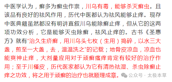 一草二皮汤由川乌30g、川槿皮30g、地骨皮30g组成,具有除风、杀虫、止痒的功效,主治手足癣、灰指甲等皮肤病。
