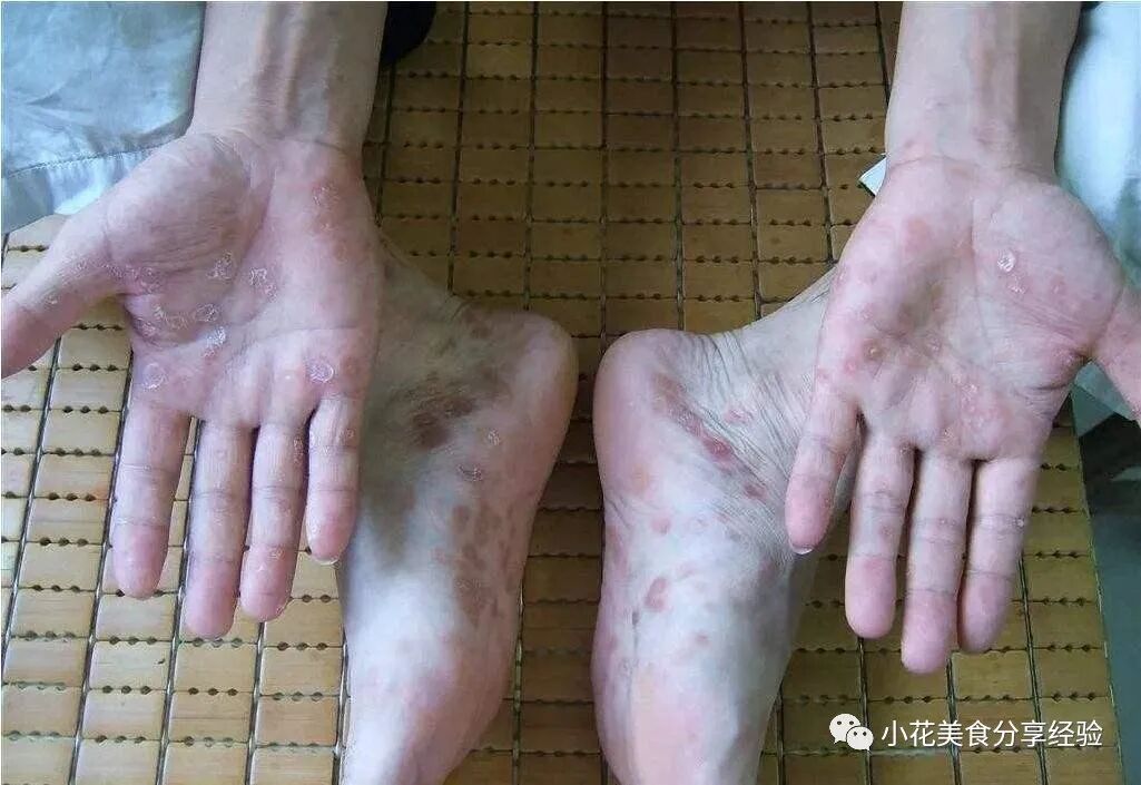 一般认为与多汗症有关,尤其是手足多汗症。起初,有小白点,然后逐渐融合,出现薄薄的纸状剥落鳞片,没有明显的瘙痒和疼痛。