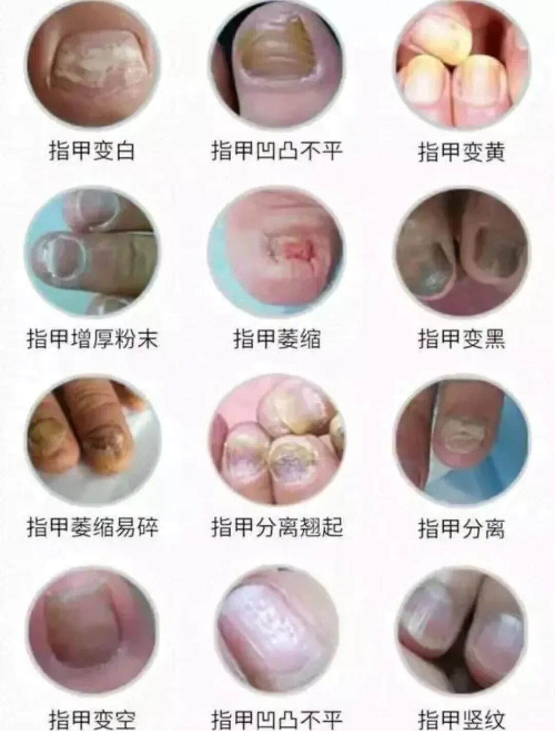 另外一些甲病均可出现变色为褐色、黄色、灰色等颜色改变,时间久了因某种原因导致甲蛋白变性流失会出现甲增厚、凹陷变形的情况,但不一定都是(甲真菌感染)灰指甲,如扁平苔藓甲、银屑病甲、慢性贫血或者某种微量元素缺乏导致的甲营养不良等。