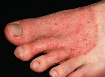表现为局部表皮角质层浸软发白。由于走动时不断摩擦表皮脱落,露出鲜红色糜烂面;严重者趾缝间、趾腹与足底交界处皮肤均可累及,瘙痒剧烈,多发于第3、4、5趾缝间。常见于多汗者。