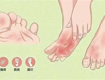 临床表现为脚趾间起水疱、脱皮或皮肤发白湿软,也可出现糜烂或皮肤增厚、粗糙、开裂,并可蔓延至足跖及边缘,剧痒。可伴局部化脓、红肿、疼痛,腹股沟淋巴结肿大,甚至形成小腿丹毒及蜂窝组织炎等继发感染。由于用手抓痒处,常传染至手而发生手癣(鹅掌风)。真菌在指(趾)甲上生长,则成甲癣(灰指甲)。真菌喜爱潮湿温暖的环境,夏季天热多汗,穿胶鞋、尼龙袜者更是为真菌提供了温床;冬季病情多好转,表现为皮肤开裂。