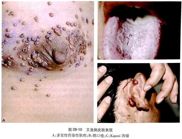 (4)真菌感染:鹅口疮是免疫缺陷最早出现的症状(图28 10B) ,此外常出现较严重的浅表真菌感染(如泛发性体股癣、手足癣和多发性甲癣等),有时表现不典型,需做真菌镜检和培养;10%~13%艾滋病患者可发生隐球菌感染,常表现为疱疹样皮损,中枢神经系统易受累。