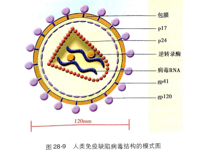 HIV在分类上属反转录病毒科中的慢病毒亚科,由单链RNA、反转录酶和结构蛋白组成。典型的病毒颗粒呈球形,直径100~140nm,病毒核心由RNA及核衣壳蛋白质(P7、P9)、反转录酶、核糖核酸酶H及整合酶所组成,外面为20面体的病毒衣壳,最外层为包膜,上有棘突,含有与宿主细胞结合的部位(图28-9)。HIV-1 基因的两端是长末端重复序列,主要的结构蛋白基因为gag、pol和enw,其中gag基因与env基因编码反转录病毒的结构蛋白,pol基因编码反转录酶与整合酶。