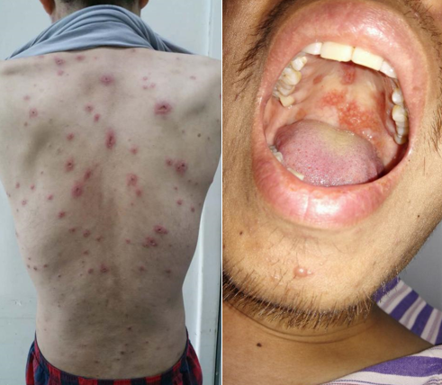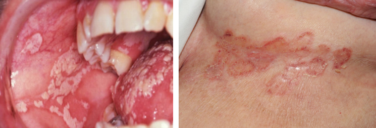 念珠菌病:鹅口疮是艾滋病晚期患者最常见的真菌感染之一,表现为口腔黏膜上的奶酪状、不易拭去的白斑。需要注意念珠菌也可发生在湿润的皮肤皱褶处(例如腹股沟或腋窝)以及阴道、龟头等生殖器官,表现为红斑、糜烂等。