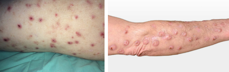 结节性瘙痒症典型表现是散在孤立的丘疹与结节,少则数个,多则数十个以上,表面粗糙,触之有坚实感。瘙痒剧烈,它主要出现在腿和手臂上。多见于免疫系统严重受损的患者。慢性经过,可长期不愈。