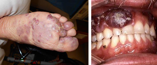 卡波西肉瘤是一种影响血管壁的肿瘤。它表现为深棕色、紫色或暗红色的皮肤病变。这种癌症会影响肺部、消化道和肝脏,可能会导致呼吸困难、皮肤肿胀以及消化道出血。这些病变通常在淋巴细胞数量急剧下降时出现,它们的出现通常表明免疫系统已受到严重损害。治疗方法包括化疗法、放疗和手术。少数病人通过ART也能获得好的转归。