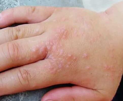 在足内侧水疱和大疱,与癣菌疹反应有关。原发损害以小水疱为主,成群或散在分布,疱壁厚内容物澄清,干燥吸收后出现脱屑。自觉瘙痒严重。