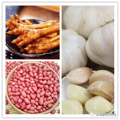 2、生大蒜头、生花生仁、鸡脚爪。蒜瓣去皮,与另2味合煮服之,肿消便愈,花生仁含有脑磷脂,可治肠塞等病,亦能疏导脚气。