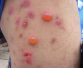 症状:皮疹为散发性、稍硬、顶端常有小水疱的丘疹,周围有纺锤形红晕,伴有剧烈瘙痒等症状。