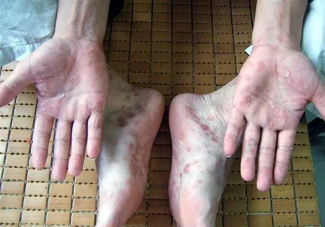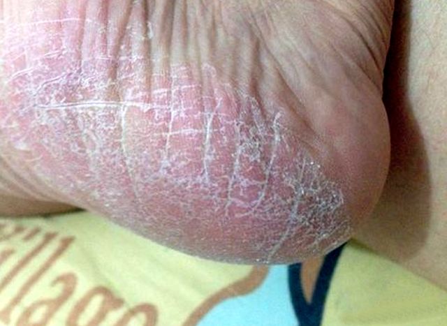 这手足癣又有四种分别,一个是水疱型的,这种在脚底和手掌经常出现,发痒,抓破了就流水;一个是潮湿型的,常常看到脚趾或者手指的连缝之间皮肤发白,糜烂,潮湿,去掉发白皮肤留下的就是潮湿的鲜红的新生皮肤;一个是脱皮型的,比较干燥,经常脱皮脱屑,偶尔也有水疱瘙痒;还有一种呢就是角质增厚型的,经常见到手掌和脚跟的地方皮肤增厚,冬季就会开裂疼痛。