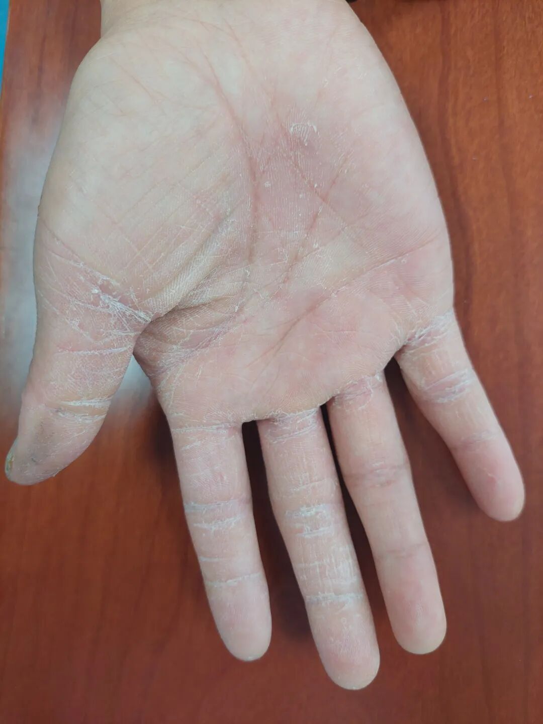 近日蓝田县人民医院皮肤科门诊接诊了一名中年女性,因手部皲裂脱皮5年前来就诊,查体发现患者手癣以一侧为著,另一侧只累及到拇指、虎口部位,同时患者已伴有足癣及甲癣多年。足癣常为手癣等皮肤癣菌的重要传染源,所以及时治疗好足癣是避免其它皮肤癣菌感染的最经济最有效的手段。别让脚气影响了手气(手癣),一双健康的手是您工作、社交必不可或缺的因素。手癣一般好发于长期浸水、接触洗涤剂、溶剂的青中年妇女,所以及时治疗显得非常必要。