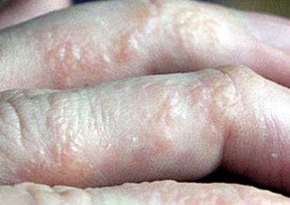 手指的侧面、手掌或脚掌先有刺痒的感觉,接着在深层皮肤产生水疱。