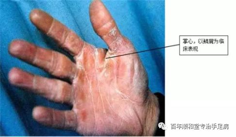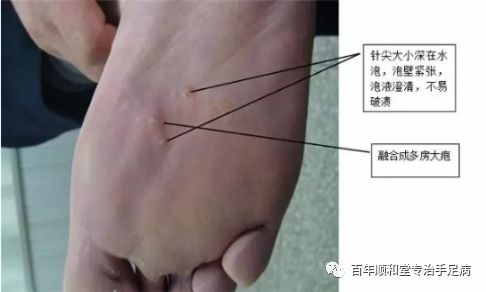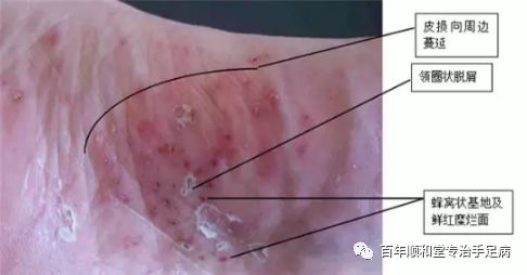 1.水泡鳞屑型:好发于指(趾)间、掌心、足跖及足侧。皮损初起为针尖大小的深在水泡,泡液请,壁厚而发亮,不易破溃,水泡散在或群集,可融合成多房型大疱,撕去泡壁露出蜂窝状基地及鲜红的糜烂面,水泡经数天后干枯,呈现领圈状脱屑。皮损可不断向周围蔓延,病情稳定时以脱屑为主。瘙痒明显。