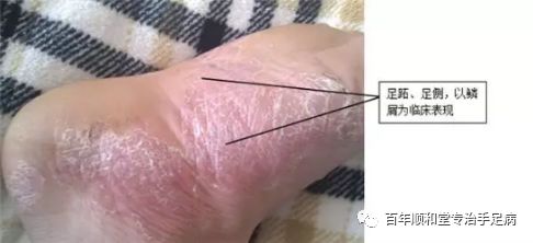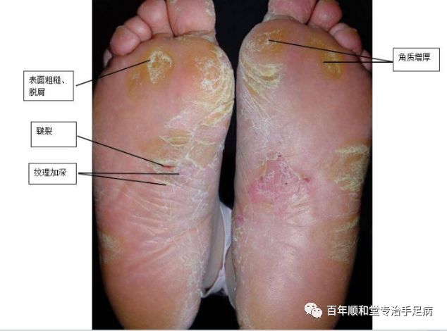 2.角化过度型:好发于掌跖部及足跟。皮损处多干燥,角质增厚,表面粗糙脱屑,纹理加深,易发生皲裂,皮损可向手、足背蔓延。一般无瘙痒,有皲裂时疼痛。