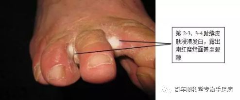 3.浸渍糜烂型:也称间擦型,好发于指(趾)缝,足癣尤以第3-4和4-5趾间多见。表现为皮肤浸渍发白,表面松软易剥脱,露出潮红糜烂面甚至裂隙。有不同程度的瘙痒,继发细菌感染时有恶臭味。