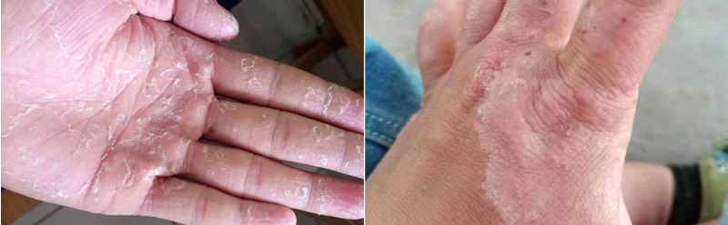常发生在手掌和手指等部位,水疱位于表皮深处,可能成批出现并伴有不同程度的瘙痒。水疱干涸后会形成衣领状脱屑,但通常不会伴有皲裂。
