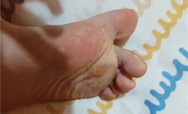 好发于指(趾)间、掌心,足跖及足侧缘。皮损主要是水疱和鳞屑。
