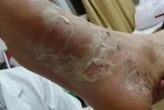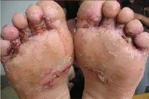 手足癣的临床表现为脚趾间起水疱、脱皮或皮肤发白湿软,也可出现糜烂或皮肤增厚、粗糙、开裂,并可蔓延至足跖及边缘,剧痒。可伴局部化脓、红肿、疼痛,腹股沟淋巴结肿大,甚至形成小腿丹毒及蜂窝组织炎等继发感染。